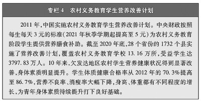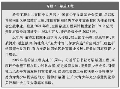 教育機(jī)會(huì)更加均等。中國(guó)教育事業(yè)優(yōu)先發(fā)展不斷深化,中國(guó)青年享有更加平等、更高質(zhì)量的教育機(jī)會(huì)。2021年,中國(guó)義務(wù)教育鞏固率達(dá)95.4%;高中階段毛入學(xué)率達(dá)91.4%;高等教育毛入學(xué)率達(dá)57.8%、在學(xué)總規(guī)模達(dá)4430萬(wàn)人,居世界第一,越來(lái)越多的青年打開了通往成功成才大門的重要路徑。覆蓋學(xué)前教育至研究生教育的學(xué)生資助政策體系建成且日趨完善,2020年資助資金總額超過(guò)2400億元、資助學(xué)生近1.5億人次,實(shí)現(xiàn)“三個(gè)全覆蓋”②。義務(wù)教育階段進(jìn)城務(wù)工人員隨遷子女、農(nóng)村和貧困地區(qū)學(xué)生等群體受教育權(quán)益得到充分保障。2020年,85.8%的進(jìn)城務(wù)工人員隨遷子女在公辦學(xué)校就讀或享受政府購(gòu)買學(xué)位服務(wù);2012年至2021年,農(nóng)村和貧困地區(qū)重點(diǎn)高校專項(xiàng)招生計(jì)劃定向招生超過(guò)82萬(wàn)人,讓更多的青年公平享有接受更好教育的機(jī)會(huì),阻斷貧困的代際傳遞。