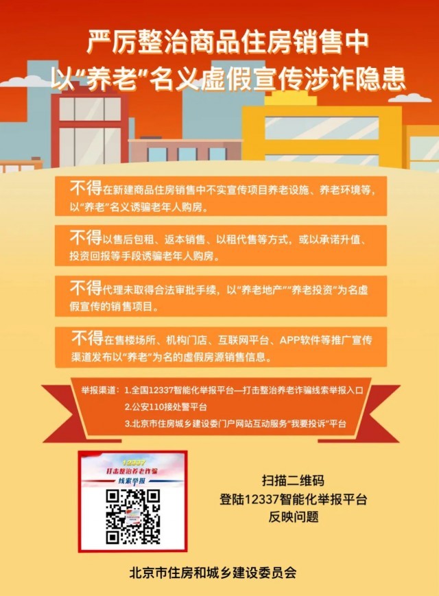據“安居北京”公眾號消息,北京住建委發(fā)布提示,不得在新建商品住房銷售中不實宣傳項目養(yǎng)老設施、養(yǎng)老環(huán)境等,以“養(yǎng)老”名義誘騙老年人購房。不得以售后包租、返本銷售、以租代售等方式,或以承諾升值、投資回報等手段誘騙老年人購房。