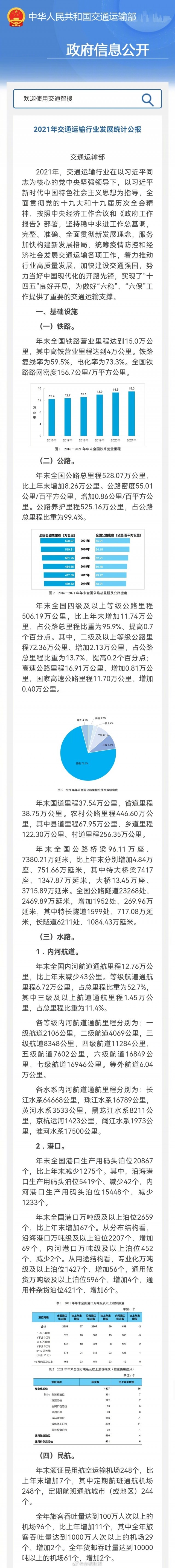 今天(25日),交通運(yùn)輸部發(fā)布《2021年交通運(yùn)輸行業(yè)發(fā)展統(tǒng)計(jì)公報(bào)》。2021年我國(guó)完成交通固定資產(chǎn)投資3.6萬(wàn)億元,比2020年增長(zhǎng)4.1%,分結(jié)構(gòu)看,鐵路完成投資7489億元,規(guī)模繼續(xù)保持在較高水平。截至2021年末,我國(guó)高鐵營(yíng)業(yè)里程達(dá)到4萬(wàn)公里,占鐵路營(yíng)業(yè)里程比重超過(guò)1/4。此外,我國(guó)農(nóng)村交通網(wǎng)絡(luò)通達(dá)通暢水平穩(wěn)步提升。去年,我國(guó)農(nóng)村公路里程446.6萬(wàn)公里,比2020年增加8.4萬(wàn)公里。農(nóng)村快遞服務(wù)營(yíng)業(yè)網(wǎng)點(diǎn)數(shù)量占比提高至30%以上,快遞服務(wù)鄉(xiāng)鎮(zhèn)網(wǎng)點(diǎn)覆蓋率達(dá)到98%,服務(wù)滿意度進(jìn)一步提高。