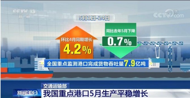 央視網(wǎng)消息:5月26日,交通運輸部發(fā)布數(shù)據(jù)顯示,5月以來,全國港口航道保持暢通,主要生產(chǎn)指標穩(wěn)定向好。