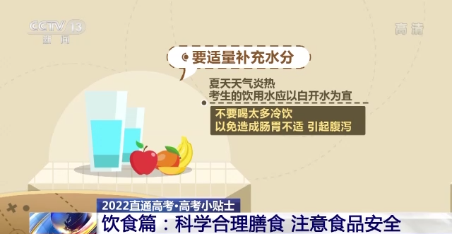 同時,要適量補充水分。夏天天氣炎熱,考生的飲用水應以白開水為宜,不要喝太多冷飲,以免造成腸胃不適,引起腹瀉。如遇高溫天氣,建議考生適當補充淡鹽水,多吃新鮮蔬果,清淡飲食。