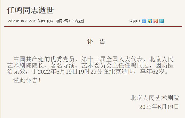 中國共產(chǎn)黨的優(yōu)秀黨員,第十三屆全國人大代表,北京人民藝術劇院院長、著名導演、藝術委員會主任任鳴同志,因病醫(yī)治無效,于2022年6月19日19時29分在北京逝世,享年62歲。