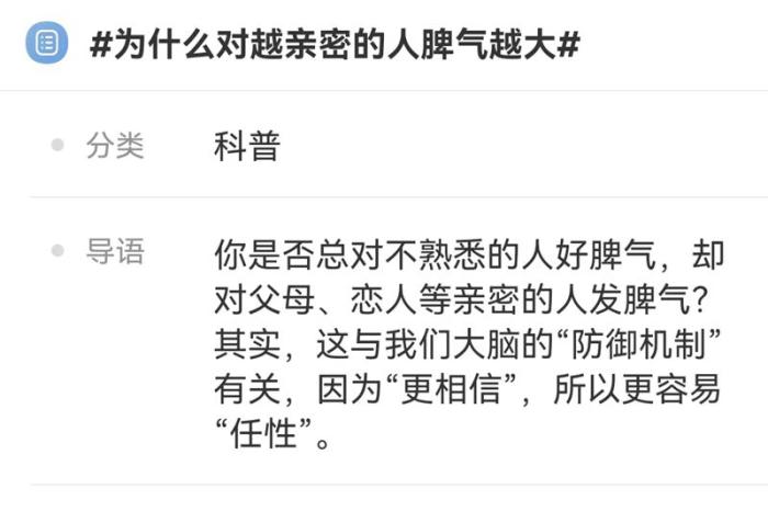 心理咨詢師楊琳瓊分析,潛意識中,我們知道對親近的人發(fā)脾氣會遭遇什么,這個風險是可以接受的,并且這種親密關(guān)系不會因此而摧毀。