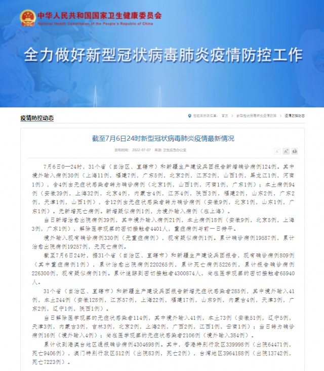 截至7月6日24時(shí),據(jù)31個(gè)?。ㄗ灾螀^(qū)、直轄市)和新疆生產(chǎn)建設(shè)兵團(tuán)報(bào)告,現(xiàn)有確診病例809例(其中重癥病例1例),累計(jì)治愈出院病例220265例,累計(jì)死亡病例5226例,累計(jì)報(bào)告確診病例226300例,現(xiàn)有疑似病例1例。累計(jì)追蹤到密切接觸者4300874人,尚在醫(yī)學(xué)觀察的密切接觸者65940人。