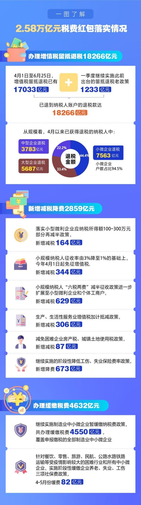 國(guó)家稅務(wù)總局?jǐn)?shù)據(jù)顯示,截至6月25日,新的組合式稅費(fèi)支持政策累計(jì)新增退稅減稅降費(fèi)及緩稅緩費(fèi)約2.58萬(wàn)億元。預(yù)計(jì)上半年新的組合式稅費(fèi)支持政策將新增退稅減稅降費(fèi)及緩稅緩費(fèi)約2.86萬(wàn)億元。