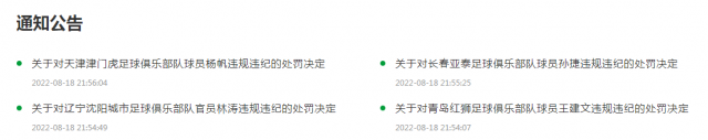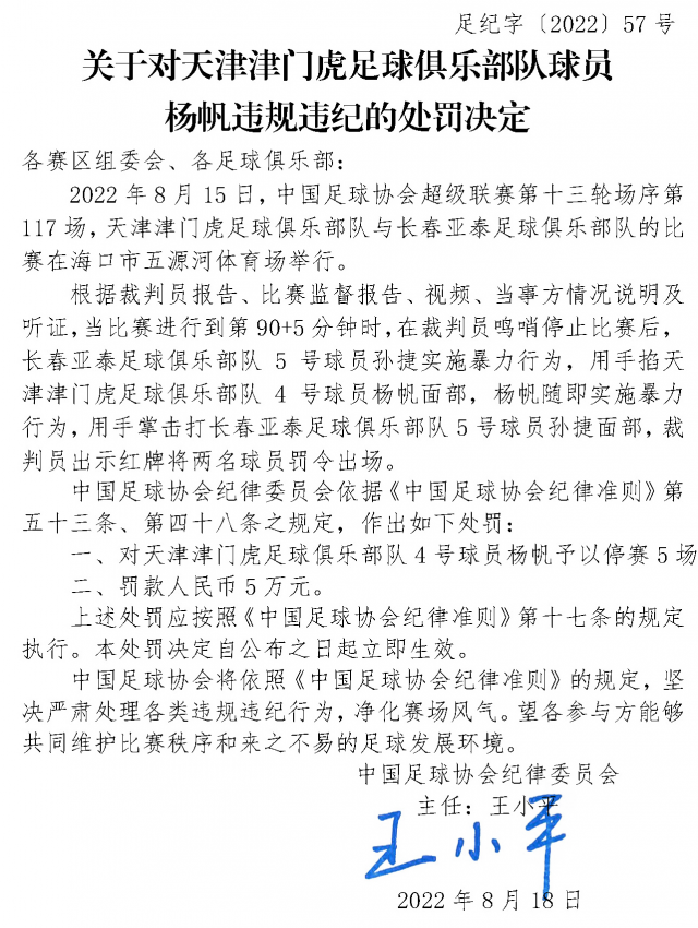 18日晚,中國足協(xié)網(wǎng)站發(fā)布4則球員、俱樂部官員違規(guī)違紀的處罰決定,中超天津津門虎球員楊帆、中超長春亞泰球員孫捷及中乙青島紅獅球員王建文均停賽5場,中甲遼寧沈陽城市足球俱樂部官員林濤6場比賽禁止進入體育場。處罰決定全文如下:
