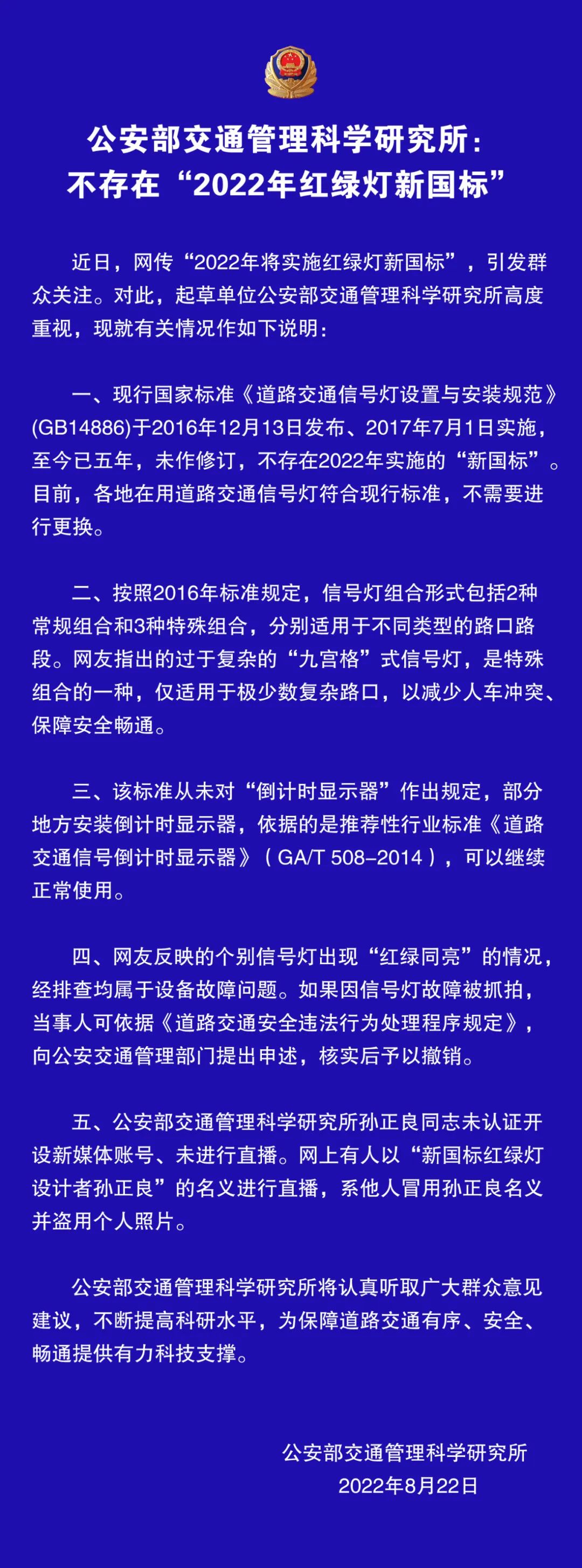 公安部交通管理科學研究所:不存在“2022年紅綠燈新國標”!