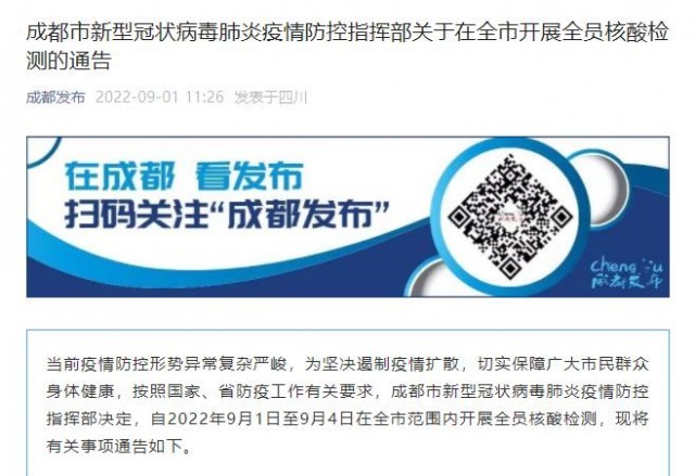 當(dāng)前疫情防控形勢異常復(fù)雜嚴峻,為堅決遏制疫情擴散,切實保障廣大市民群眾身體健康,按照國家、省防疫工作有關(guān)要求,成都市新型冠狀病毒肺炎疫情防控指揮部決定,自2022年9月1日至9月4日在全市范圍內(nèi)開展全員核酸檢測,現(xiàn)將有關(guān)事項通告如下。
