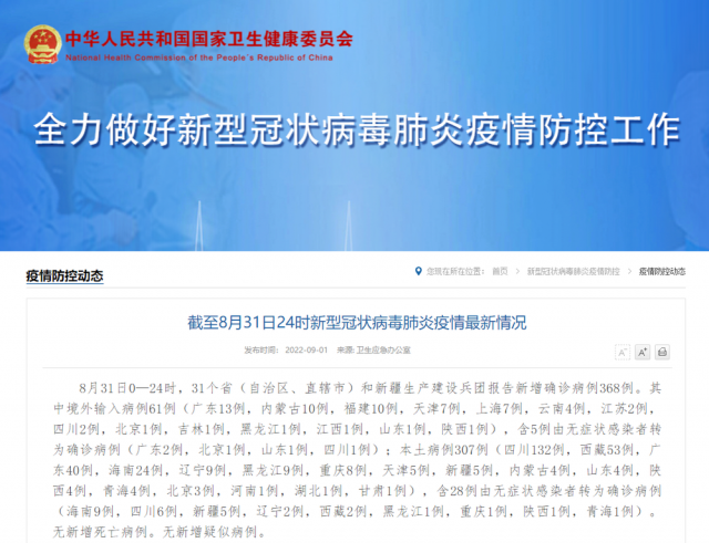 8月31日0—24時(shí),31個(gè)?。ㄗ灾螀^(qū)、直轄市)和新疆生產(chǎn)建設(shè)兵團(tuán)報(bào)告新增確診病例368例。其中境外輸入病例61例(廣東13例,內(nèi)蒙古10例,福建10例,天津7例,上海7例,云南4例,江蘇2例,四川2例,北京1例,吉林1例,黑龍江1例,江西1例,山東1例,陜西1例),含5例由無(wú)癥狀感染者轉(zhuǎn)為確診病例(廣東2例,北京1例,山東1例,四川1例);本土病例307例(四川132例,西藏53例,廣東40例,海南24例,遼寧9例,黑龍江9例,重慶8例,天津5例,新疆5例,內(nèi)蒙古4例,山東4例,陜西4例,青海4例,北京3例,河南1例,湖北1例,甘肅1例),含28例由無(wú)癥狀感染者轉(zhuǎn)為確診病例(海南9例,四川6例,新疆5例,遼寧2例,西藏2例,黑龍江1例,重慶1例,陜西1例,青海1例)。無(wú)新增死亡病例。無(wú)新增疑似病例。