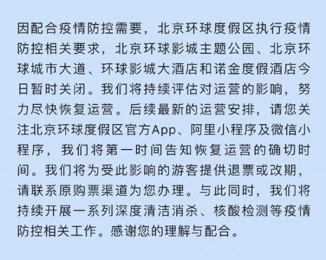 據(jù)@北京環(huán)球度假區(qū) 微博消息,因配合疫情防控需要,北京環(huán)球度假區(qū)執(zhí)行疫情防控相關(guān)要求,北京環(huán)球影城主題公園、北京環(huán)球城市大道、環(huán)球影城大酒店和諾金度假酒店今日暫時關(guān)閉。我們將持續(xù)評估對運營的影響,努力盡快恢復(fù)運營。后續(xù)最新的運營安排,請您關(guān)注北京環(huán)球度假區(qū)官方App、阿里小程序及微信小程序,我們將第一時間告知恢復(fù)運營的確切時間。我們將為受此影響的游客提供退票或改期,請聯(lián)系原購票渠道為您辦理。與此同時,我們將持續(xù)開展一系列深度清潔消殺、核酸檢測等疫情防控相關(guān)工作。感謝您的理解與配合。