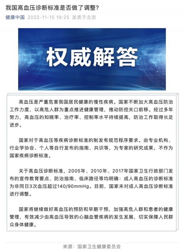 國(guó)家衛(wèi)健委:國(guó)家未對(duì)成人高血壓診斷標(biāo)準(zhǔn)進(jìn)行調(diào)整