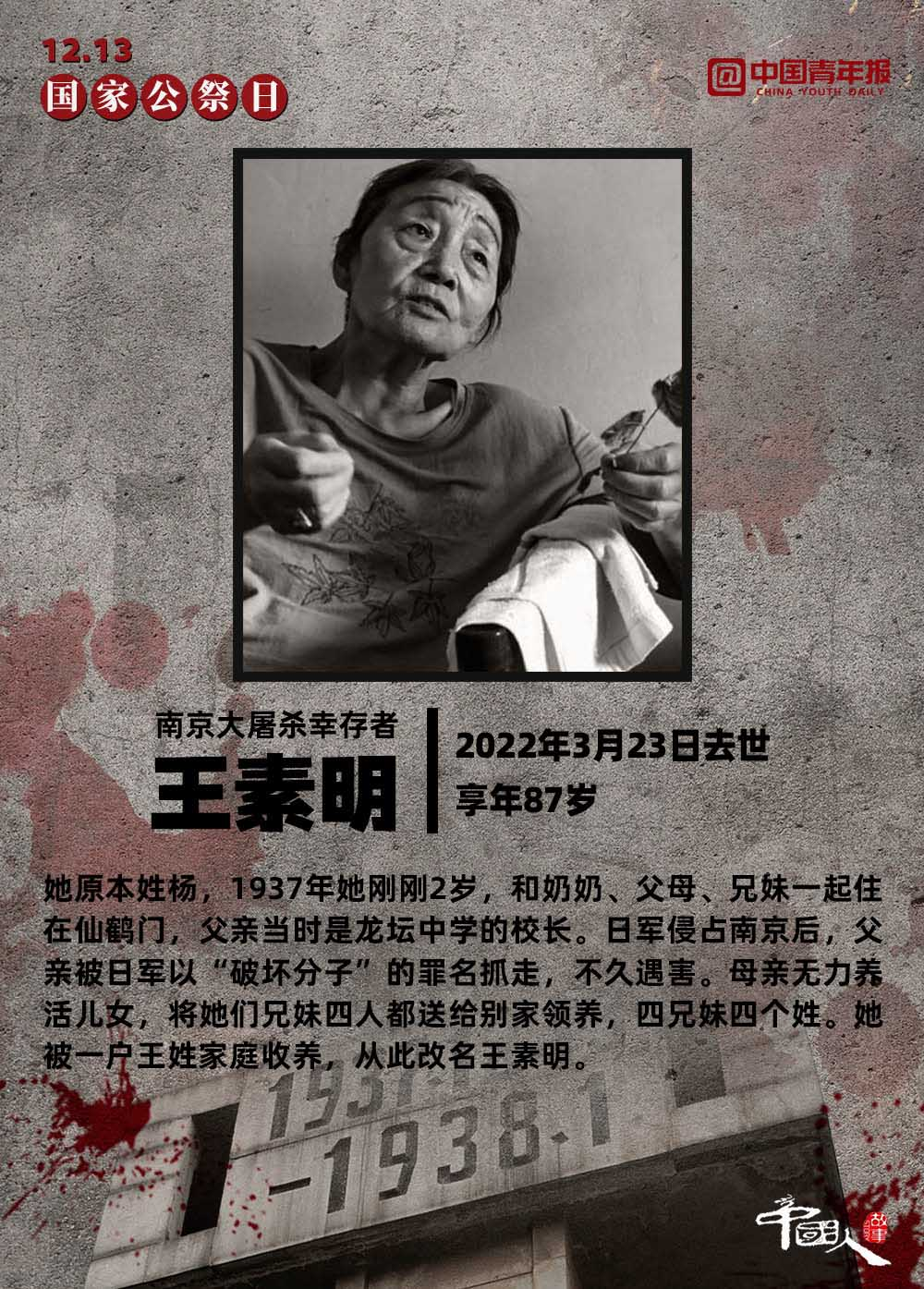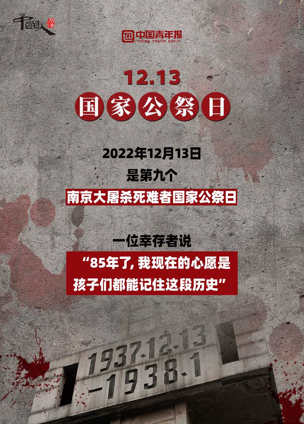 12月13日,是第九個(gè)南京大屠殺死難者國家公祭日 。截至2022年12月12日,南京侵華日軍受害者援助協(xié)會登記在冊在世的幸存者僅剩54位。一位南京大屠殺幸存者說:“85年了,我現(xiàn)在的心愿是孩子們都能記住這段歷史?!弊屛覀儗⑦@段歷史銘刻在內(nèi)心深處,讓“記住”化作一種責(zé)任,伴著我們堅(jiān)定前行。