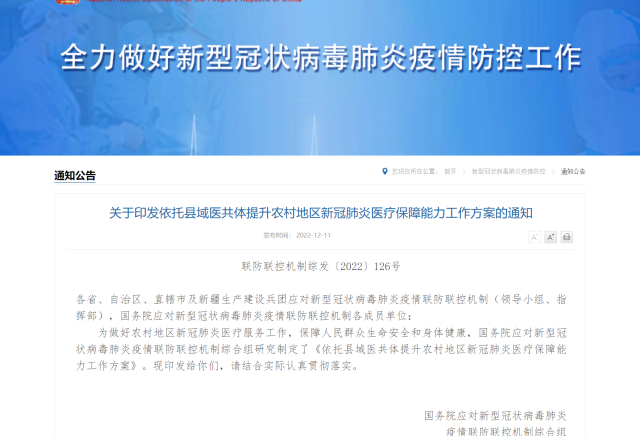 為做好農(nóng)村地區(qū)新冠肺炎醫(yī)療服務(wù)工作,保障高齡合并基礎(chǔ)疾病等重癥風(fēng)險(xiǎn)較高的感染者及時(shí)救治,在農(nóng)村地區(qū),以縣域醫(yī)共體為載體,提升縣級(jí)醫(yī)院重癥救治能力,發(fā)揮鄉(xiāng)鎮(zhèn)衛(wèi)生院和村衛(wèi)生室健康監(jiān)測作用,最大可能降低重癥率、病亡率,國務(wù)院聯(lián)防聯(lián)控機(jī)制11日發(fā)布《關(guān)于印發(fā)依托縣域醫(yī)共體提升農(nóng)村地區(qū)新冠肺炎醫(yī)療保障能力工作方案的通知》(下稱“方案”)。