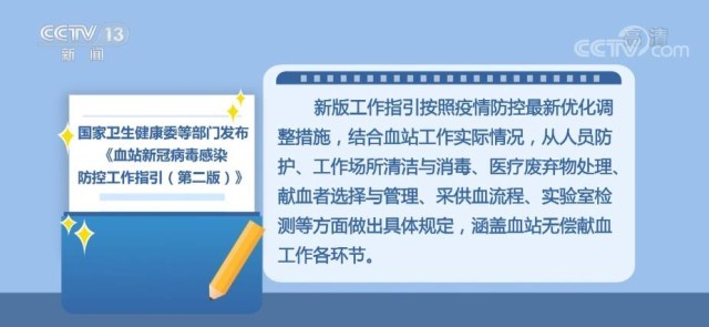 央視網(wǎng)消息:為落實(shí)進(jìn)一步優(yōu)化新冠肺炎疫情防控措施相關(guān)要求,指導(dǎo)采供血機(jī)構(gòu)科學(xué)有效做好無(wú)償獻(xiàn)血工作,國(guó)家衛(wèi)生健康委辦公廳、中央軍委后勤保障部衛(wèi)生局組織專(zhuān)家對(duì)2021年印發(fā)的《血站新冠肺炎疫情常態(tài)化防控工作指引》進(jìn)行修訂,形成《血站新冠病毒感染防控工作指引(第二版)》,指導(dǎo)采供血機(jī)構(gòu)切實(shí)做好新形勢(shì)下疫情防控工作,保障血站工作人員和獻(xiàn)血者安全,實(shí)現(xiàn)血液安全供應(yīng)。