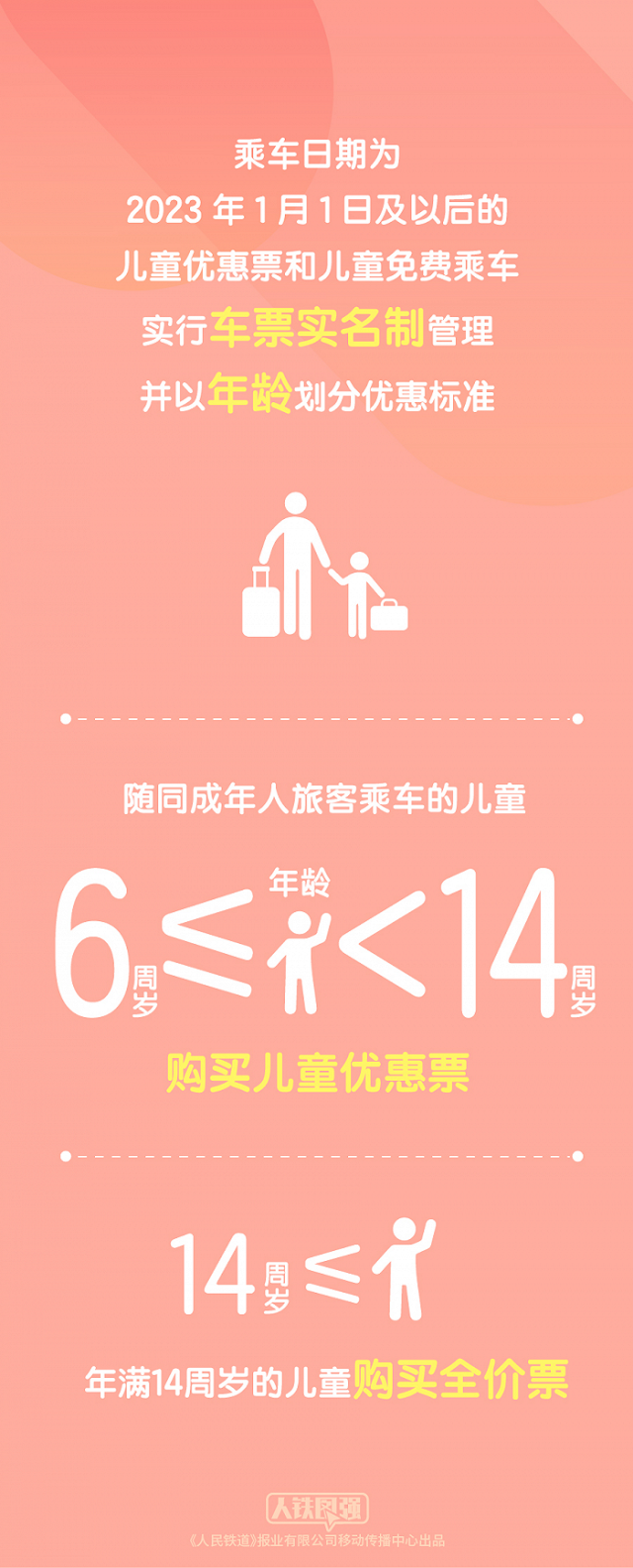 “中國鐵路”微信公眾號消息,新版《鐵路旅客運(yùn)輸規(guī)程》將于2023年1月1日起施行。購買兒童票有哪些新變化?一起看看吧。