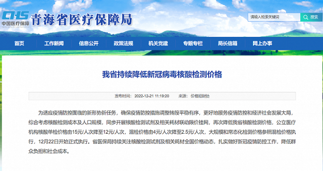 據(jù)青海省醫(yī)療保障局網(wǎng)站消息,為適應(yīng)疫情防控面臨的新形勢新任務(wù),確保疫情防控措施調(diào)整轉(zhuǎn)段平穩(wěn)有序,更好地服務(wù)疫情防控和經(jīng)濟(jì)社會發(fā)展大局,綜合考慮核酸檢測成本及人口規(guī)模,同步開展核酸檢測試劑及相關(guān)耗材聯(lián)動限價掛網(wǎng),再次降低青海省核酸檢測價格,公立醫(yī)療機(jī)構(gòu)核酸單檢價格由15元/人次降至12元/人次,混檢價格由4元/人次降至2.5元/人次,大規(guī)模和常態(tài)化檢測價格參照混檢價格執(zhí)行,12月22日開始正式執(zhí)行。省醫(yī)保局持續(xù)關(guān)注核酸檢測試劑及相關(guān)耗材全國價格動態(tài),扎實做好新冠疫情防控工作,降低群眾負(fù)擔(dān)和社會成本。