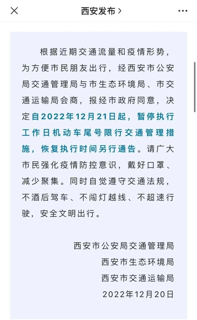 12月20日,陜西西安多部門發(fā)布通知,根據(jù)近期交通流量和疫情形勢,為方便市民朋友出行,決定自2022年12月21日起,暫停執(zhí)行工作日機(jī)動車尾號限行交通管理措施,恢復(fù)執(zhí)行時間另行通告。