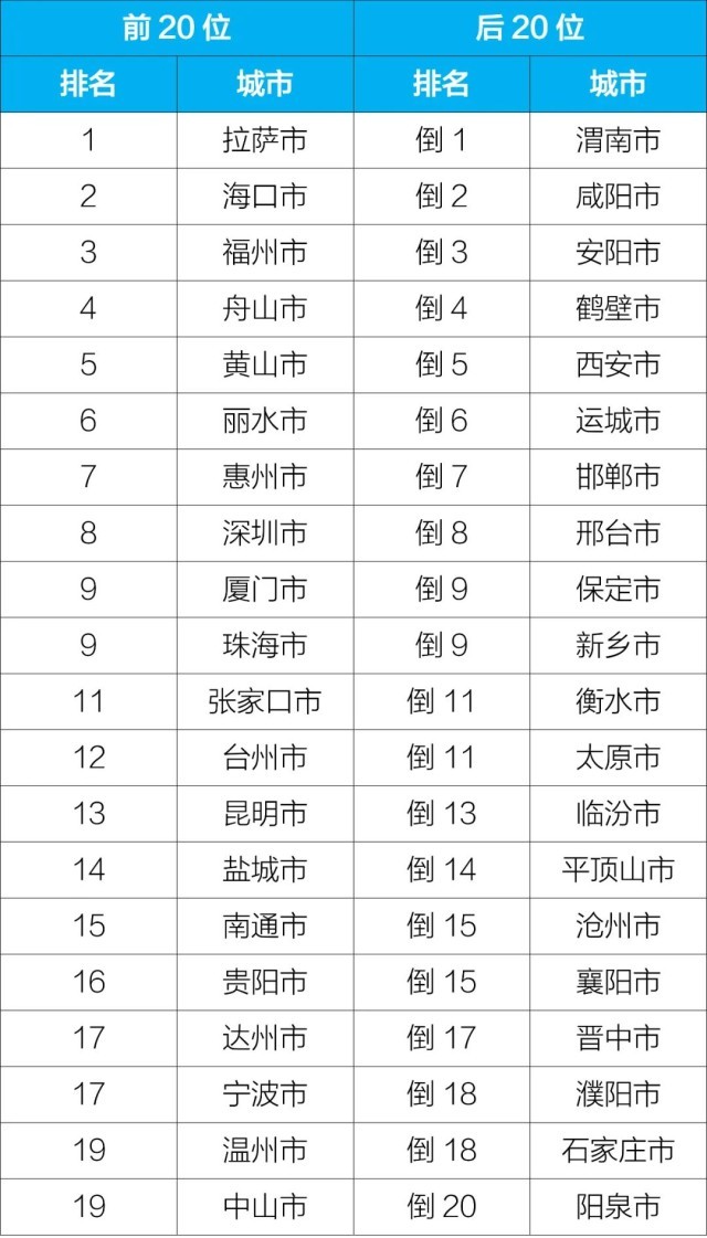 1—11月,168個(gè)重點(diǎn)城市中,拉薩、??诤椭凵绞械瘸鞘锌諝赓|(zhì)量相對(duì)較好(從第1名至第20名);渭南、荊州和咸陽(yáng)市等城市空氣質(zhì)量相對(duì)較差(從倒數(shù)第1名至倒數(shù)第20名),見附表2。