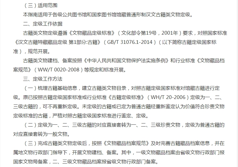 在定級工作依據(jù)中,古籍類文物定級遵循《文物藏品定級標(biāo)準(zhǔn)》(文化部令第19號,2001年)要求,對照國家標(biāo)準(zhǔn)《漢文古籍特藏藏品定級 第1部分:古籍》(GB/T 31076.1-2014)(以下簡稱古籍定級國家標(biāo)準(zhǔn)),規(guī)范開展。