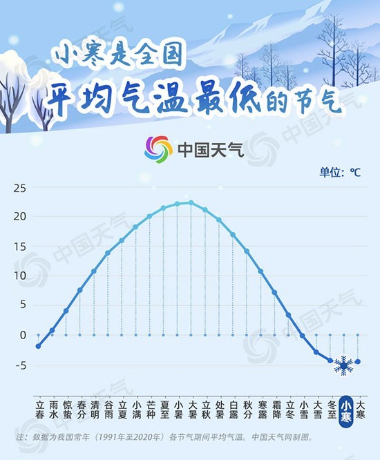 據(jù)中國天氣網(wǎng)氣象分析師王偉躍介紹,小寒節(jié)氣冷空氣活動頻繁,氣溫下降明顯,北方天寒地凍,滴水成冰,南方霜雪交加,冷透肌骨。氣象數(shù)據(jù)顯示,小寒是二十四節(jié)氣中全國平均氣溫最低的節(jié)氣,僅-5.1℃;其次是大寒節(jié)氣,達-4.5℃。