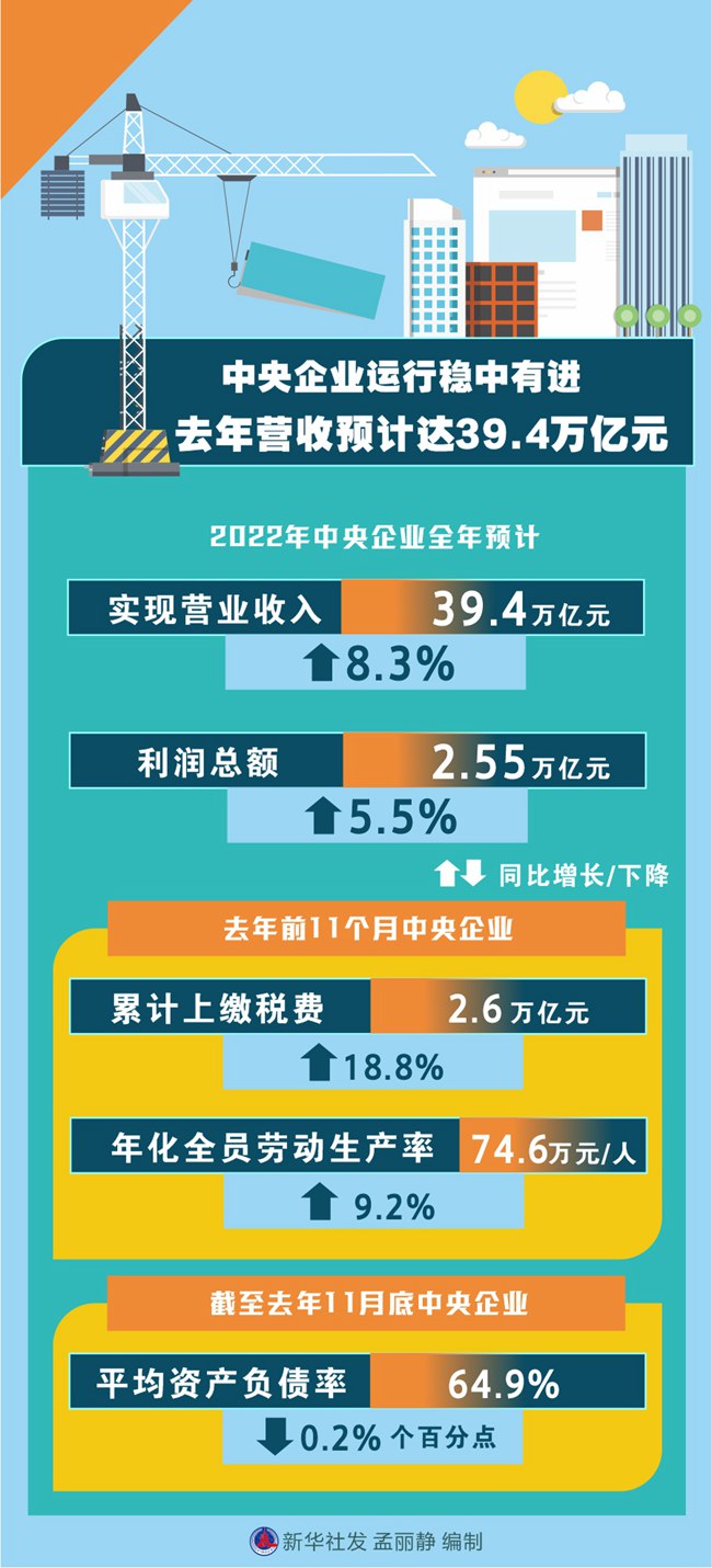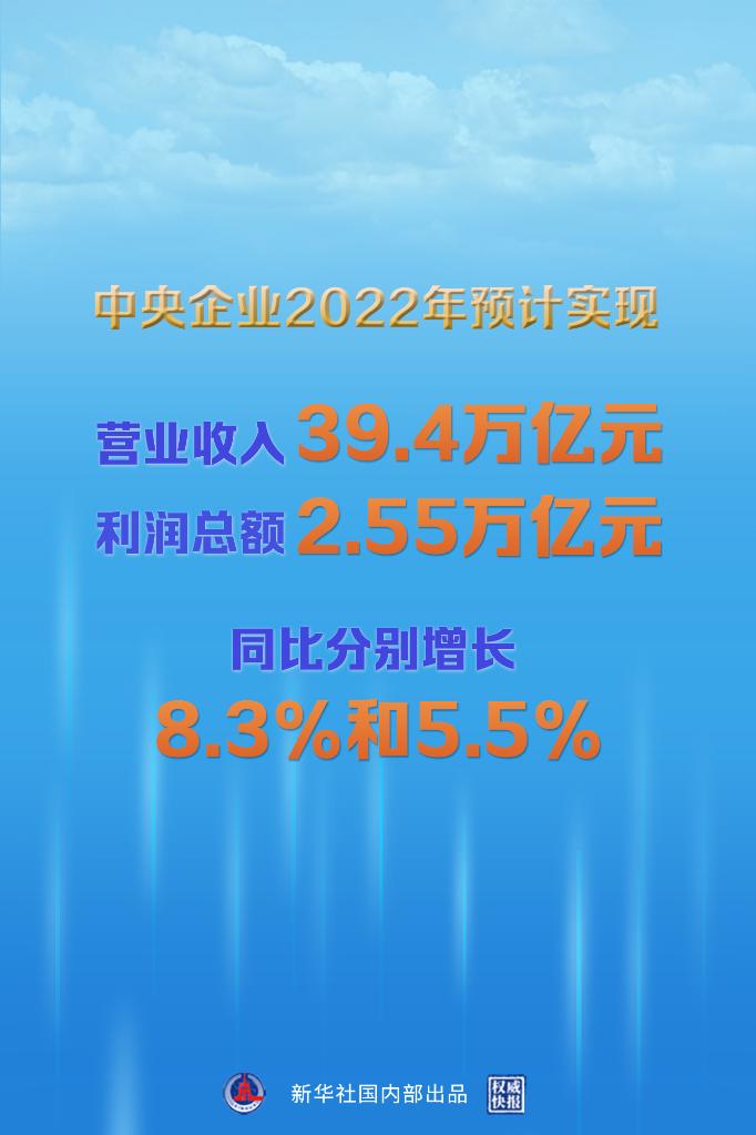 新華社北京1月5日電(記者王希)2022年,國(guó)資央企統(tǒng)籌疫情防控和企業(yè)生產(chǎn)經(jīng)營(yíng),統(tǒng)籌發(fā)展和安全,推動(dòng)經(jīng)濟(jì)運(yùn)行實(shí)現(xiàn)穩(wěn)中有進(jìn),中央企業(yè)全年預(yù)計(jì)實(shí)現(xiàn)營(yíng)業(yè)收入39.4萬億元、利潤(rùn)總額2.55萬億元,同比分別增長(zhǎng)8.3%和5.5%。