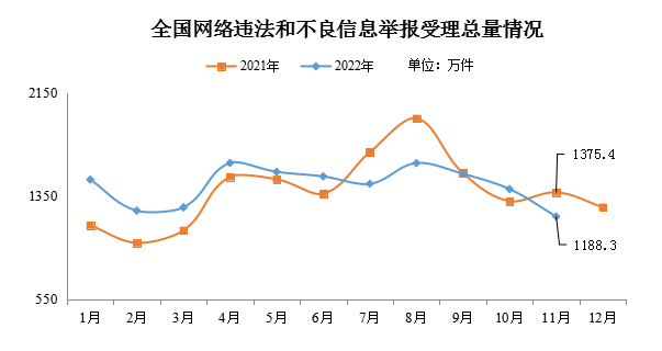 2022年11月全國受理網(wǎng)絡舉報量環(huán)比下降15.1%