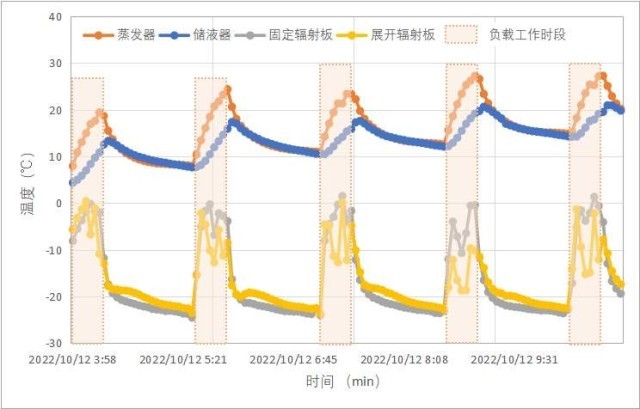 中科院微小衛(wèi)星創(chuàng)新院的可展收式輻射器成功在軌實(shí)現(xiàn)首次應(yīng)用,輻射器執(zhí)行機(jī)構(gòu)已順利完成六十余次展開和收攏動作,連續(xù)五軌動態(tài)試驗結(jié)果(如圖10)表明環(huán)路熱管-可展收式輻射器集成系統(tǒng)在負(fù)載工作時段啟動性能良好,輻射器連續(xù)展開-收攏可實(shí)現(xiàn)散熱能力在軌大范圍調(diào)控。