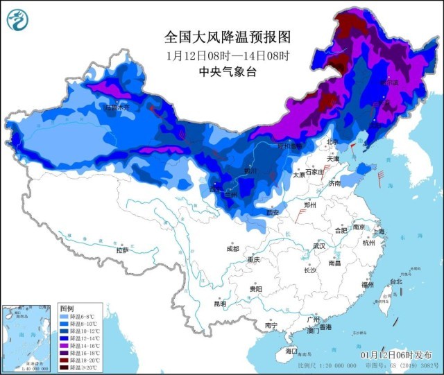 1月12日6時,中央氣象臺繼續(xù)發(fā)布寒潮藍(lán)色預(yù)警:受強冷空氣影響,預(yù)計,1月12日8時至1月16日8時,寒潮天氣將自西向東影響我國大部地區(qū),其中,12日主要影響西北地區(qū),13日至15日影響我國中東部地區(qū)。我國大部地區(qū)氣溫將先后下降8~12℃,其中,新疆沿天山以北、甘肅西部和中南部、內(nèi)蒙古中東部、東北地區(qū)、江漢東部、江淮、江南、華南北部、貴州等地降溫14~18℃,內(nèi)蒙古中東部、黑龍江東部、吉林東部、遼寧東北部等地的部分地區(qū)降溫超過20℃,并伴有4~6級、陣風(fēng)6~8級的大風(fēng),新疆山口風(fēng)力可達(dá)9~11級或以上。東部和南部海區(qū)有7~9級風(fēng),陣風(fēng)可達(dá)10~11級。降溫過后,17日早晨,最低氣溫0℃線將南壓至云南東部至貴州南部、湖南南部、福建北部、浙江東部一線。