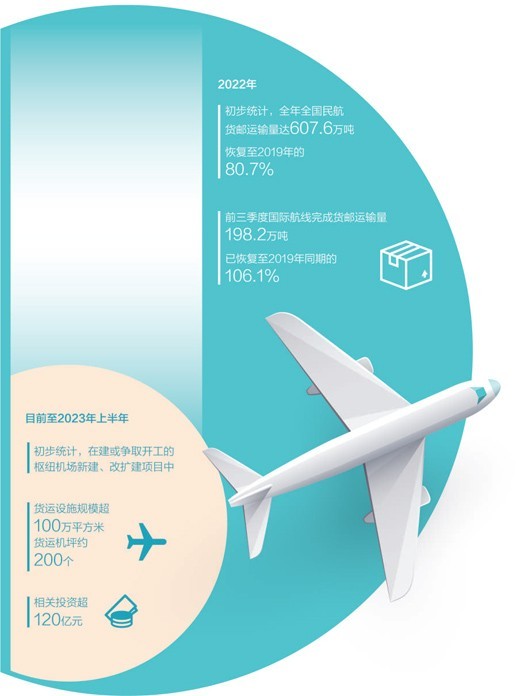 民航局有關(guān)負責人介紹,過去5年,航空貨運基礎(chǔ)設(shè)施建設(shè)取得積極進展,新增航空貨運能力600萬噸以上。下一步,將加強航空貨運設(shè)施規(guī)劃建設(shè)指導(dǎo),初步統(tǒng)計,目前至2023年上半年在建或爭取開工的樞紐機場新建、改擴建項目中,貨運設(shè)施規(guī)模已超過100萬平方米、貨運機坪約200個,相關(guān)投資超過120億元。