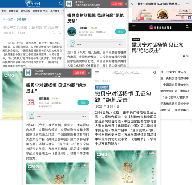 未播先熱!這部當(dāng)代人幾乎聞所未聞的千古“奇書”,一下子吸引了海內(nèi)外網(wǎng)民目光。海內(nèi)外諸多媒體迅速關(guān)注,紛紛報(bào)道。截至目前,歐洲華語廣播電臺、匈牙利聯(lián)合報(bào)、北歐時(shí)報(bào)等數(shù)十家海外媒體對第二季內(nèi)容的轉(zhuǎn)發(fā)和報(bào)道,已輻射10多個(gè)國家和地區(qū),在海外再次掀起“典籍熱”。