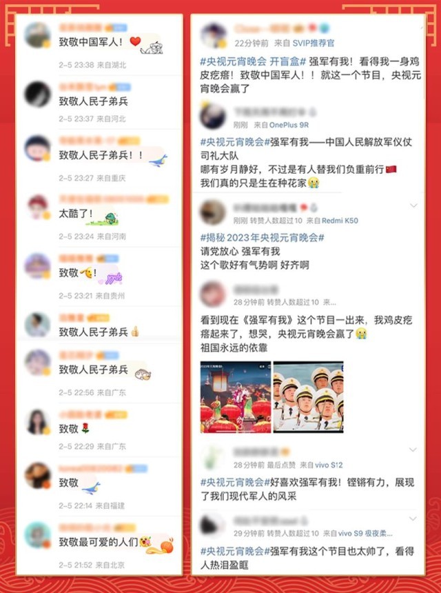 “請(qǐng)黨放心,強(qiáng)軍有我”“清澈的愛(ài),獻(xiàn)給我的祖國(guó)”……聲聲誓言、字字鏗鏘。首次參加總臺(tái)元宵晚會(huì)的中國(guó)人民解放軍儀仗司禮大隊(duì)奏唱的歌曲《強(qiáng)軍有我》,不僅唱出中國(guó)軍人的拳拳赤子心,更唱出了“最可愛(ài)的人”那豪邁激情和磅礴氣勢(shì)。整齊劃一的動(dòng)作、堅(jiān)定有力的眼神讓無(wú)數(shù)網(wǎng)友直呼:“震撼!這就是中國(guó)排面”“為人民子弟兵熱淚盈眶”“致敬中國(guó)軍人!感謝你們?yōu)榇蠹邑?fù)重前行”。而網(wǎng)友們也用整齊一致的留言共同致敬“最可愛(ài)的人”。