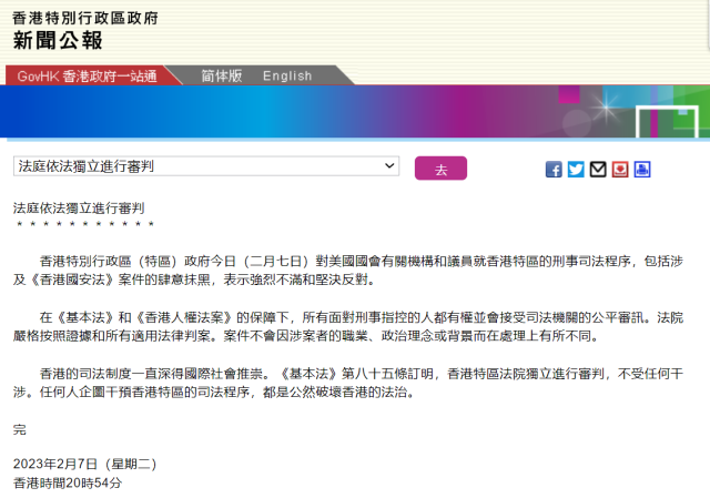 香港特區(qū)政府:堅決反對美國會有關機構及議員抹黑香港刑事司法程序