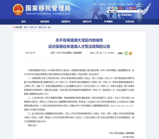 中國青年報(bào)客戶端北京2月9日電(中青報(bào)·中青網(wǎng)記者 何春中)中華人民共和國出入境管理局2月9日發(fā)布公告,為便利粵港澳大灣區(qū)人才從事科研學(xué)術(shù)交流活動(dòng),促進(jìn)服務(wù)粵港澳大灣區(qū)建設(shè)發(fā)展,自2023年2月20日起在粵港澳大灣區(qū)內(nèi)地城市試點(diǎn)實(shí)施往來港澳人才簽注政策。