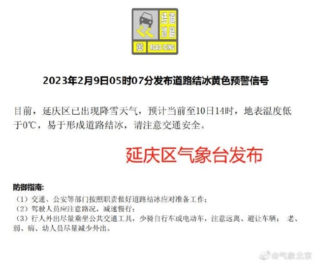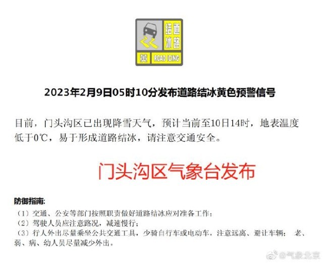 另外,目前石景山、門頭溝、延慶區(qū)氣象臺已發(fā)布道路結冰黃色預警信號,上述區(qū)域已出現(xiàn)降雪,易形成道路結冰,請大家出行注意交通安全。