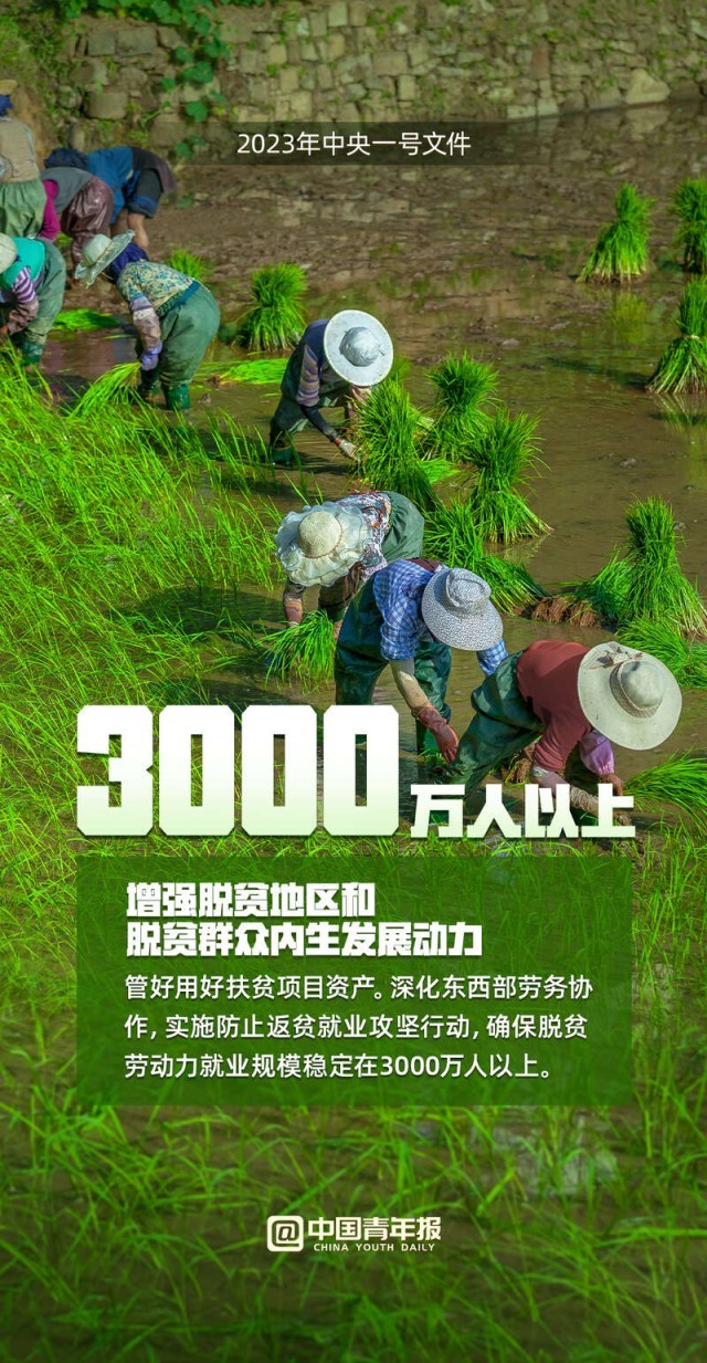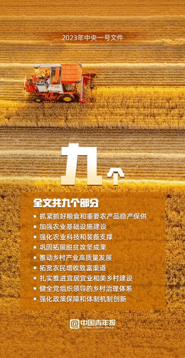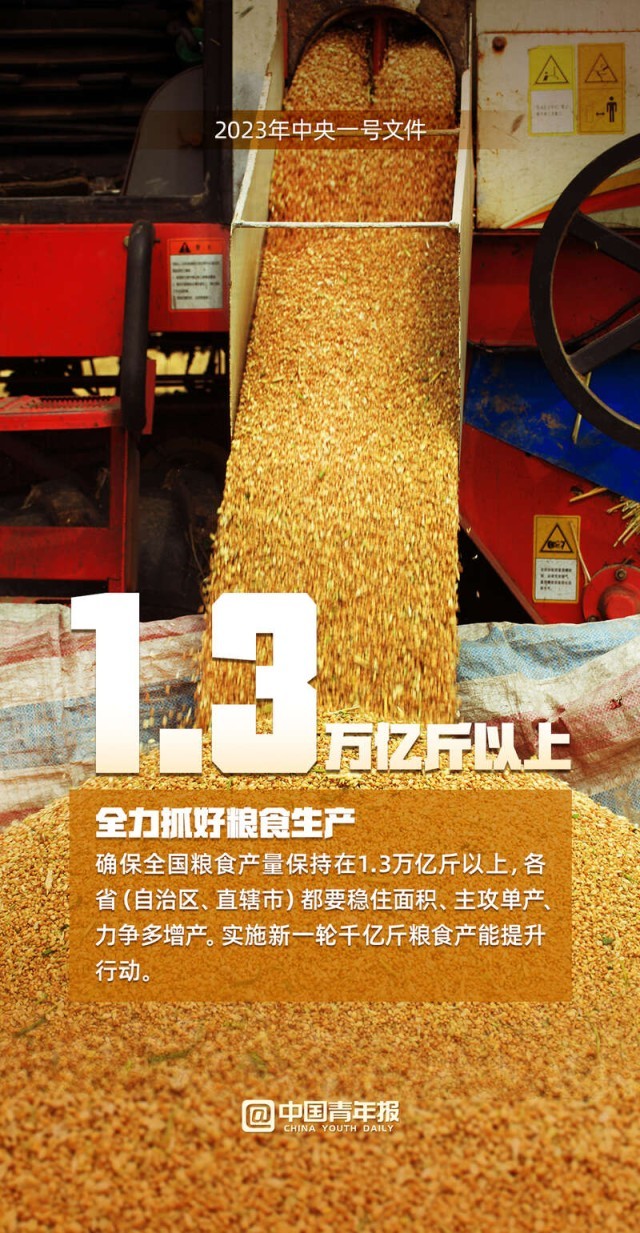 中國青年報客戶端訊(中青報·中青網(wǎng)見習記者 魏婉 制圖 程璨)“確保全國糧食產(chǎn)量保持在1.3萬億斤以上、確保脫貧勞動力就業(yè)規(guī)模穩(wěn)定在3000萬人以上……”2月13日,2023年中央一號文件正式發(fā)布,這份文件題為《中共中央 國務院關于做好2023年全面推進鄉(xiāng)村振興重點工作的意見》,全文共九個部分。文件提出,堅決守牢確保糧食安全、防止規(guī)模性返貧等底線,扎實推進鄉(xiāng)村發(fā)展、鄉(xiāng)村建設、鄉(xiāng)村治理等重點工作,加快建設農(nóng)業(yè)強國,建設宜居宜業(yè)和美鄉(xiāng)村。