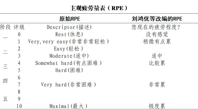 使用主觀疲勞感知評估量表,作為逐步提高活動水平的指南。該量表是世界衛(wèi)生組織在《新冠病毒相關(guān)疾病康復(fù)指導(dǎo)手冊》對感染后患者通過記錄日?;顒右约爸饔^疲勞量表評分(RPE值)來監(jiān)控自身的狀況,并用于指導(dǎo)如何提高自身活動水平的量表。該量表將運(yùn)動中主觀感受的費(fèi)力程度劃分為0分(完全不費(fèi)力)到10分(最大程度的用力),即RPE值0~10分。