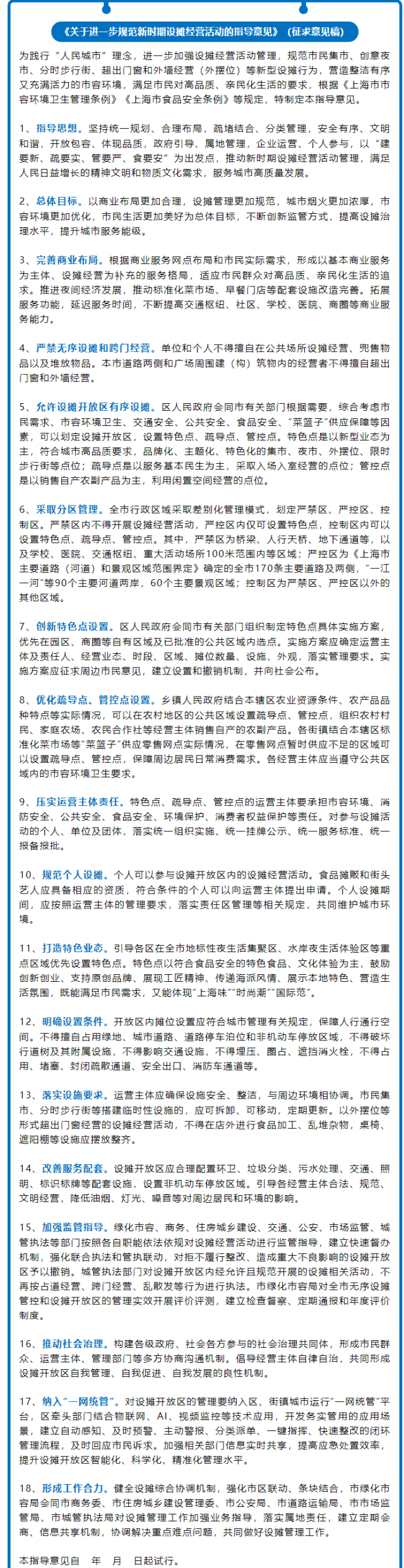 央視網(wǎng)消息:據(jù)“綠色上?!惫娞?hào)2月20日消息,根據(jù)《上海市市容環(huán)境衛(wèi)生管理?xiàng)l例》,為進(jìn)一步加強(qiáng)設(shè)攤經(jīng)營(yíng)活動(dòng)管理,規(guī)范市民集市、創(chuàng)意夜市、分時(shí)步行街、超出門(mén)窗和外墻經(jīng)營(yíng)(簡(jiǎn)稱(chēng)外擺位)等新型設(shè)攤行為,結(jié)合上海市實(shí)際,上海市綠化和市容管理局經(jīng)會(huì)同市相關(guān)部門(mén)研究,擬定了《關(guān)于進(jìn)一步規(guī)范新時(shí)期設(shè)攤經(jīng)營(yíng)活動(dòng)的指導(dǎo)意見(jiàn)》(征求意見(jiàn)稿),現(xiàn)面向社會(huì)公開(kāi)征求意見(jiàn)。市民和各單位可以將書(shū)面意見(jiàn)直接寄送至上海市膠州路768號(hào)308室,郵編:200040;也可以發(fā)送電子郵件至shsrglc@126.com。征求意見(jiàn)截止日期:2023年3月22日。