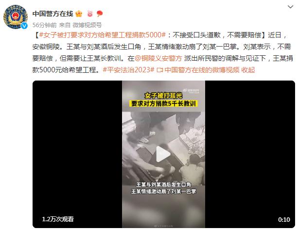 今年1月,一則“離奇”新聞曾引發(fā)網(wǎng)友們的熱議——在安徽銅陵,王某與劉某在酒后發(fā)生口角,王某情緒激動下扇了劉某一巴掌。事后劉某表示不接受口頭道歉,不需要賠償,但要求王某捐款5000元給“希望工程”。