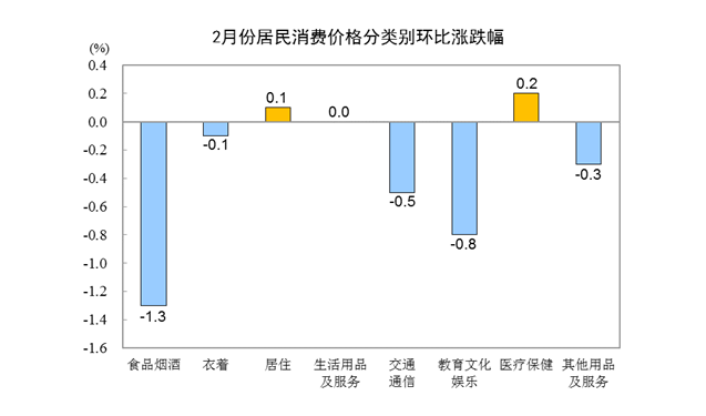 2月份,全國居民消費(fèi)價格環(huán)比下降0.5%。其中,城市下降0.5%,農(nóng)村下降0.5%;食品價格下降2.0%,非食品價格下降0.2%;消費(fèi)品價格下降0.6%,服務(wù)價格下降0.4%。