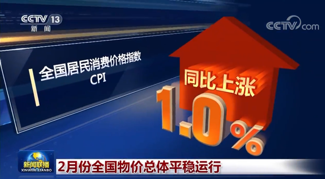 央視網(wǎng)消息(新聞聯(lián)播):國家統(tǒng)計(jì)局今天(3月9日)發(fā)布數(shù)據(jù)顯示,2月份,受市場供應(yīng)充足等因素影響,全國居民消費(fèi)價(jià)格指數(shù)(CPI)同比上漲1.0%,漲幅比上月回落1.1個(gè)百分點(diǎn),物價(jià)總體平穩(wěn)運(yùn)行。