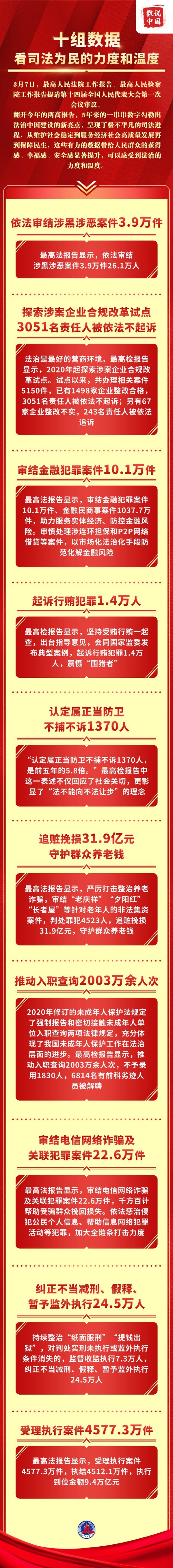 翻開今年的兩高報告,5年來的一串串數(shù)字勾勒出法治中國建設(shè)的新亮點,呈現(xiàn)了極不平凡的司法進程,從維護社會穩(wěn)定到服務(wù)經(jīng)濟社會高質(zhì)量發(fā)展再到保障民生,這些有力的數(shù)據(jù)帶給人民群眾的獲得感、幸福感、安全感顯著提升,可以感受到法治的力度和溫度。
