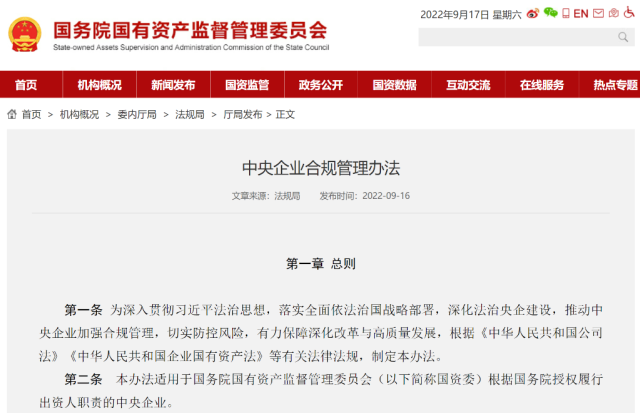 2022年,國資委印發(fā)《中央企業(yè)合規(guī)管理辦法》。管理辦法在充分借鑒世界一流企業(yè)先進(jìn)經(jīng)驗(yàn)的基礎(chǔ)上,明確提出中央企業(yè)應(yīng)當(dāng)結(jié)合實(shí)際設(shè)立首席合規(guī)官,不新增領(lǐng)導(dǎo)崗位和職數(shù),由總法律顧問兼任,對(duì)企業(yè)主要負(fù)責(zé)人負(fù)責(zé),領(lǐng)導(dǎo)合規(guī)管理部門組織開展相關(guān)工作,指導(dǎo)所屬單位加強(qiáng)合規(guī)管理。(記者王希)
