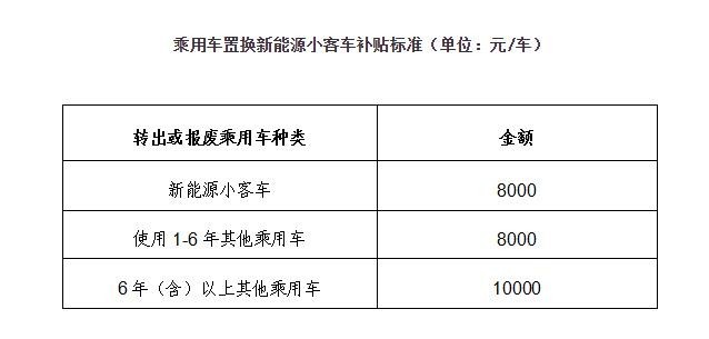 方案指出,報(bào)廢或轉(zhuǎn)出新能源小客車(chē)的,每車(chē)給予8000元補(bǔ)貼;報(bào)廢或轉(zhuǎn)出使用1-6年其他類(lèi)型乘用車(chē)(非新能源)的,每車(chē)給予8000元補(bǔ)貼;報(bào)廢或轉(zhuǎn)出使用6年(含)以上其他乘用車(chē)的,每車(chē)給予10000元補(bǔ)貼。