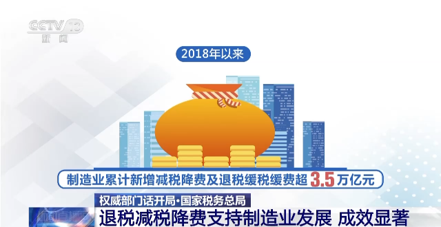 據(jù)介紹,在一系列退稅減稅降費(fèi)舉措中,下調(diào)制造業(yè)等領(lǐng)域的增值稅稅率、率先提高制造業(yè)研發(fā)費(fèi)用加計(jì)扣除比例、加大制造業(yè)增值稅留抵退稅力度等減負(fù)措施,有效支持了制造業(yè)緩解經(jīng)營壓力、增強(qiáng)創(chuàng)新動(dòng)力、激活發(fā)展?jié)摿Α?/p>