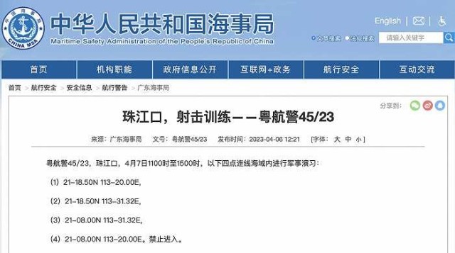 央視網(wǎng)消息:據(jù)中國海事局網(wǎng)站消息,廣東海事局發(fā)布航行警告,4月7日11時(shí)至15時(shí),珠江口部分海域內(nèi)將進(jìn)行軍事演習(xí),禁止進(jìn)入。