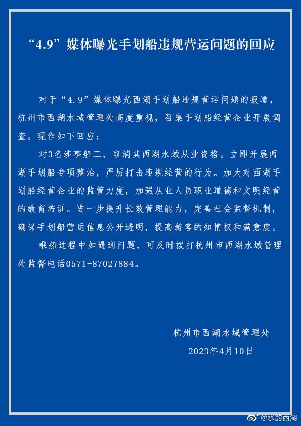 對(duì)涉事3名船工,取消其西湖水域從業(yè)資格。立即開展西湖手劃船專項(xiàng)整治,嚴(yán)厲打擊違規(guī)經(jīng)營的行為。加大對(duì)西湖手劃船經(jīng)營企業(yè)的監(jiān)管力度,加強(qiáng)從業(yè)人員職業(yè)道德和文明經(jīng)營的教育培訓(xùn)。進(jìn)一步提升長(zhǎng)效管理能力,完善社會(huì)監(jiān)督機(jī)制,確保手劃船營運(yùn)信息公開透明,提高游客的知情權(quán)和滿意度。