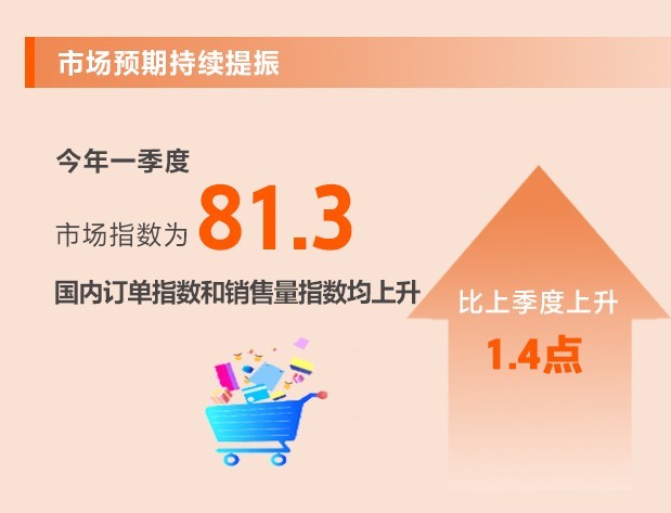 今年以來經濟循環(huán)加快暢通,市場需求逐步恢復,消費勢頭有所好轉,市場預期明顯恢復。一季度,市場指數(shù)為81.3,環(huán)比上升1.4點。所調查的8個行業(yè)中,國內訂單指數(shù)和銷售量指數(shù)均上升,7個行業(yè)銷售價格指數(shù)上升。