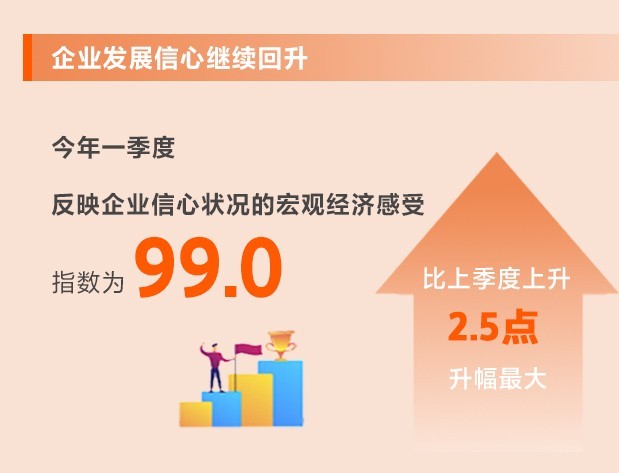 今年以來,我國經濟運行持續(xù)回暖,增長動能不斷釋放,發(fā)展信心明顯增強。一季度,反映企業(yè)信心狀況的宏觀經濟感受指數(shù)為99.0,比上季度上升2.5點,升幅最大。從宏觀經濟感受指數(shù)的細項看,宏觀感受指數(shù)為103.6,比上季度上升2.4點,高于景氣臨界值100;行業(yè)運行指數(shù)為94.3,比上季度上升2.6點,升幅較大。