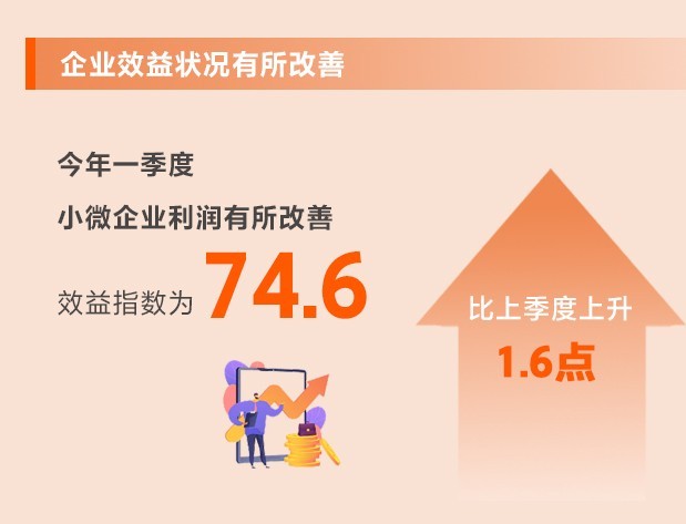 企業(yè)生產經營加速恢復,原材料價格漲幅收窄,以及延續(xù)優(yōu)化減稅降費政策減輕企業(yè)負擔,小微企業(yè)利潤有所改善。一季度,效益指數(shù)為74.6,比上季度上升1.6點,反彈幅度較大,但仍處于歷史較低位。所調查的8個行業(yè)效益指數(shù)均有所上升。