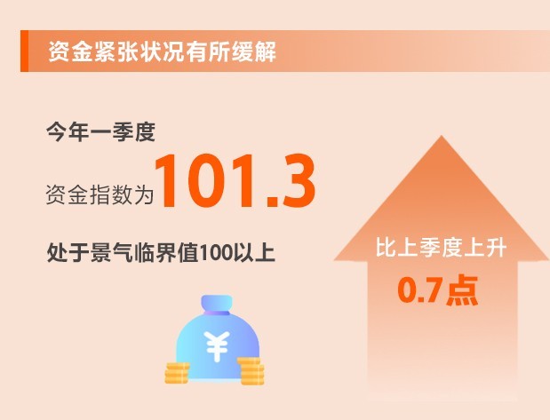 央行降準以及指導金融機構繼續(xù)支持小微企業(yè),多措并舉“精準滴灌”,小微企業(yè)融資狀況不斷改善。一季度,資金指數(shù)為101.3,比上季度上升0.7點,處于景氣臨界值100以上。其中,流動資金指數(shù)為86.3,比上季度上升1.1點;融資指數(shù)為90.8,環(huán)比上升0.5點。所調查的8個行業(yè)中,8個行業(yè)流動資金指數(shù)、6個行業(yè)融資指數(shù)均上升。